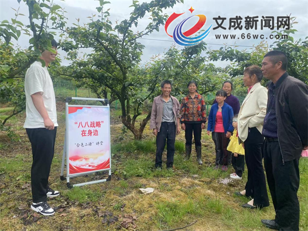 雨過天晴,空氣中彌漫著清甜的氣息。在二源鎮(zhèn)山頭村雪梨基地里的梨花已全部凋零,取代它們的是翠綠的葉子和幼小的果實。青年宣講團成員趁著清新的空氣奔赴山頭村為在家的村民做宣講。