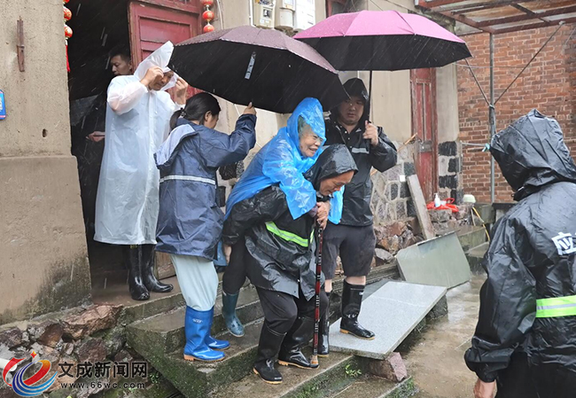 在周山畬族鄉官垟村,黨員干部挨家挨戶勸說住在小流域兩側的居民撤離至避災安置點。91歲的鄭昌竹爺爺患有嚴重支氣管炎,黨員干部耐心詢問了爺爺的需求后,從被褥到藥品、吸氧機、輪椅,都幫他搬到避災安置點。鄭爺爺的妻子李春梅奶奶說:“把我們要用的東西都搬過來了,這里還有醫生在,我們很放心。”