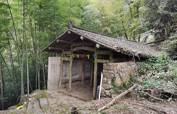 過“流米巖”約100米處,見有一棵高大的苦櫧樹立在山僻上,樹身底部開裂,樹干滿是褶皺,足見年代久遠,但大樹依然枝繁葉茂。苦櫧樹下,翠竹之間,有一處瓦房靜靜立在一塊平地上,此處便是半嶺亭。據傳明成化年間,花園人王魁金、魁珠在嶺頭建云亭庵和嶺頭亭,王魁尚在半嶺巖下建佛龕和一簡陋涼亭,供過往行人休憩。清朝時云亭庵改為云頂寺,涼亭亦重新修建,并增設茶堂,免費為行人供應茶水。今半嶺亭尚存一座用規整的桃花石和青石砌鑿而成的正方體古灶臺,約略可見當年情景。