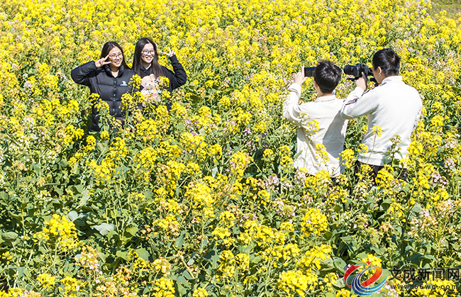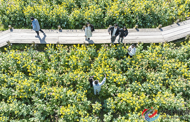 踏入油菜花田,一望無際的油菜花田宛如一片彩色海洋,微風拂過,層層疊疊的花浪此起彼伏,極目遠眺,粉紫、橘紅、金黃,各色各樣的油菜花田與藍天白云相互映襯,吸引游客駐足觀賞,拍照留念。