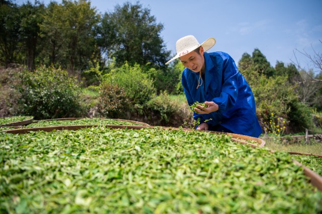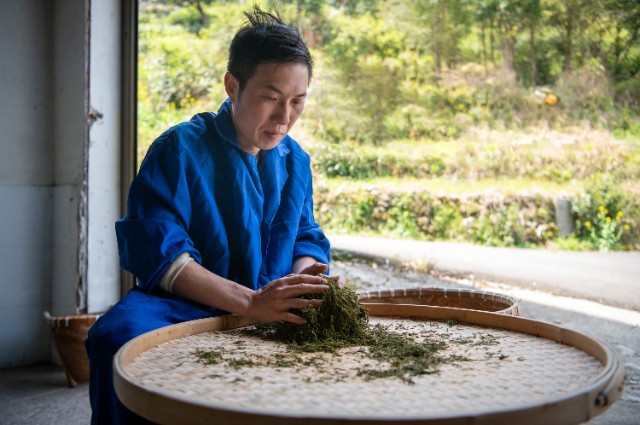 竹窨制茶工藝的第一步是日光萎凋,這些剛采摘下來的鮮嫩茶青,被均勻地鋪在竹匾上,接受著陽光照射,水分漸漸散發,茶青的質地逐漸變軟,為后續的制作工序奠定了基礎。接著揉捻工序則是賦予茶葉外形與內質的關鍵。