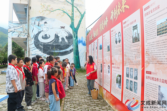 文成新聞網訊(記者 徐露露 季向賢)近日,由縣文化和廣電旅游體育局、中共文成縣委黨史研究室(文成縣地方志研究室)主辦,縣博物館承辦的紅色印記——紀念抗戰勝利80周年紅色故事圖片展巡展活動走進公陽鄉中心小學,通過豐富多樣的形式,為青少年學生帶來了一場深刻而生動的愛國主義教育課。
