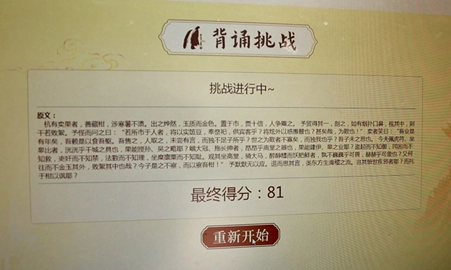 游客劉女士說(shuō):“希望孩子能多了解傳統(tǒng)文化,他背完《賣柑者言》后特別有成就感,拿到獎(jiǎng)品就更開(kāi)心了。”